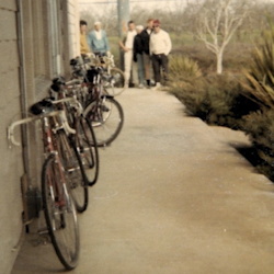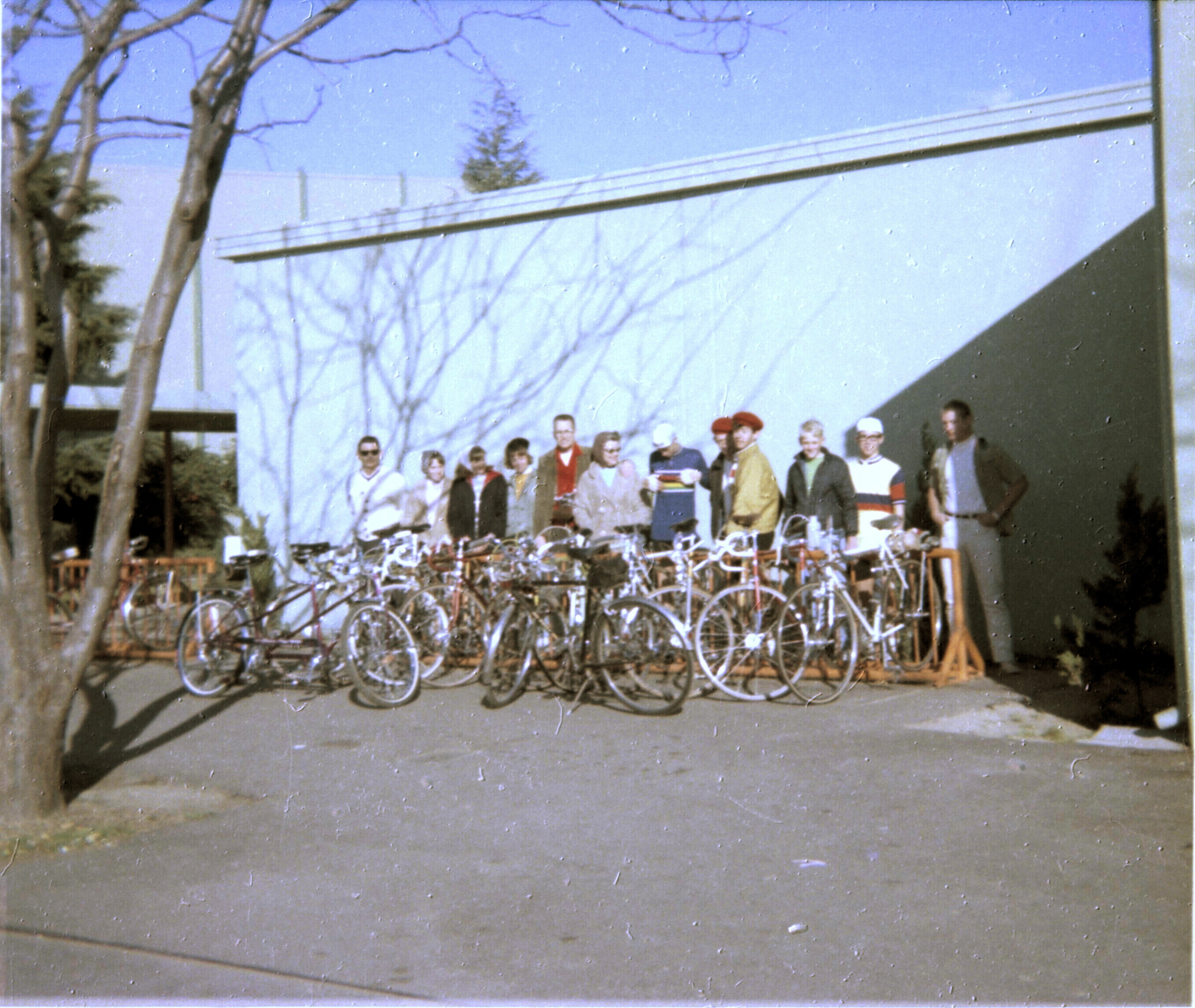 Group before departure. Robert Jackson: Downey High Government teacher and Chess Club Coach, unknown rider 1, unknown rider 2, Cindy Leighton, Henry Laws, Jean Hannah: Downey High German teacher, Neil Johnson, Paul Robinson, Jeff Cowdrey, Roger Farschon, Eldon Rosenow, and unknown Downey High teacher.
