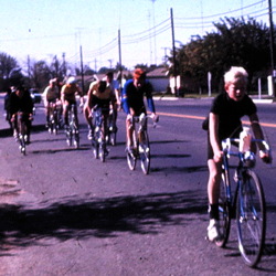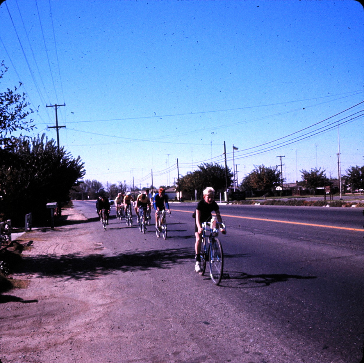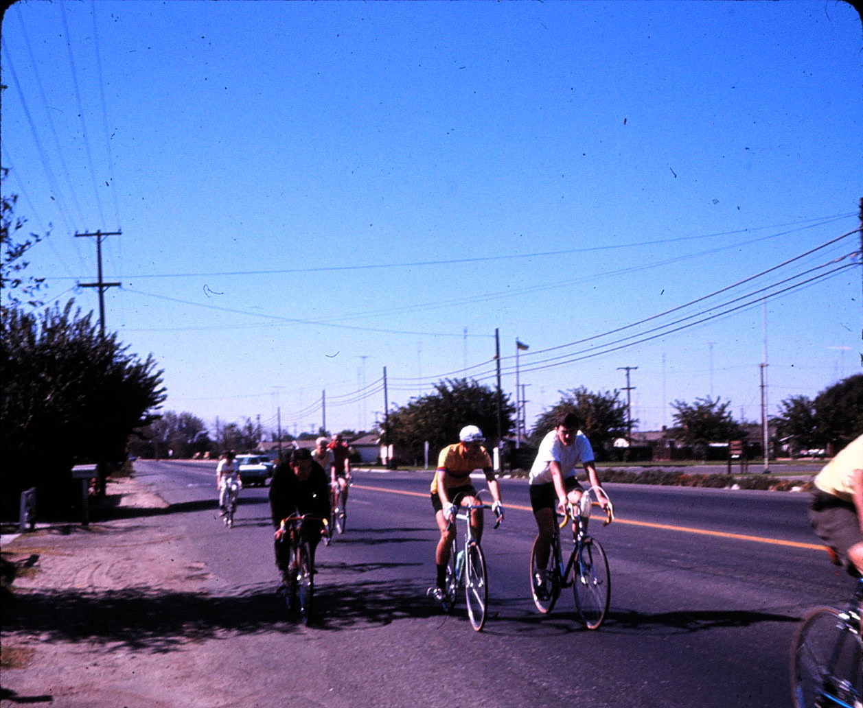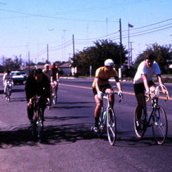 The group starting out on the ride. The only person we can identify in this picture is the second in line, at the center of the picture, Paul Robinson. The very young rider who is first in line is a clue that this is a fun ride, not a long distance or training ride.