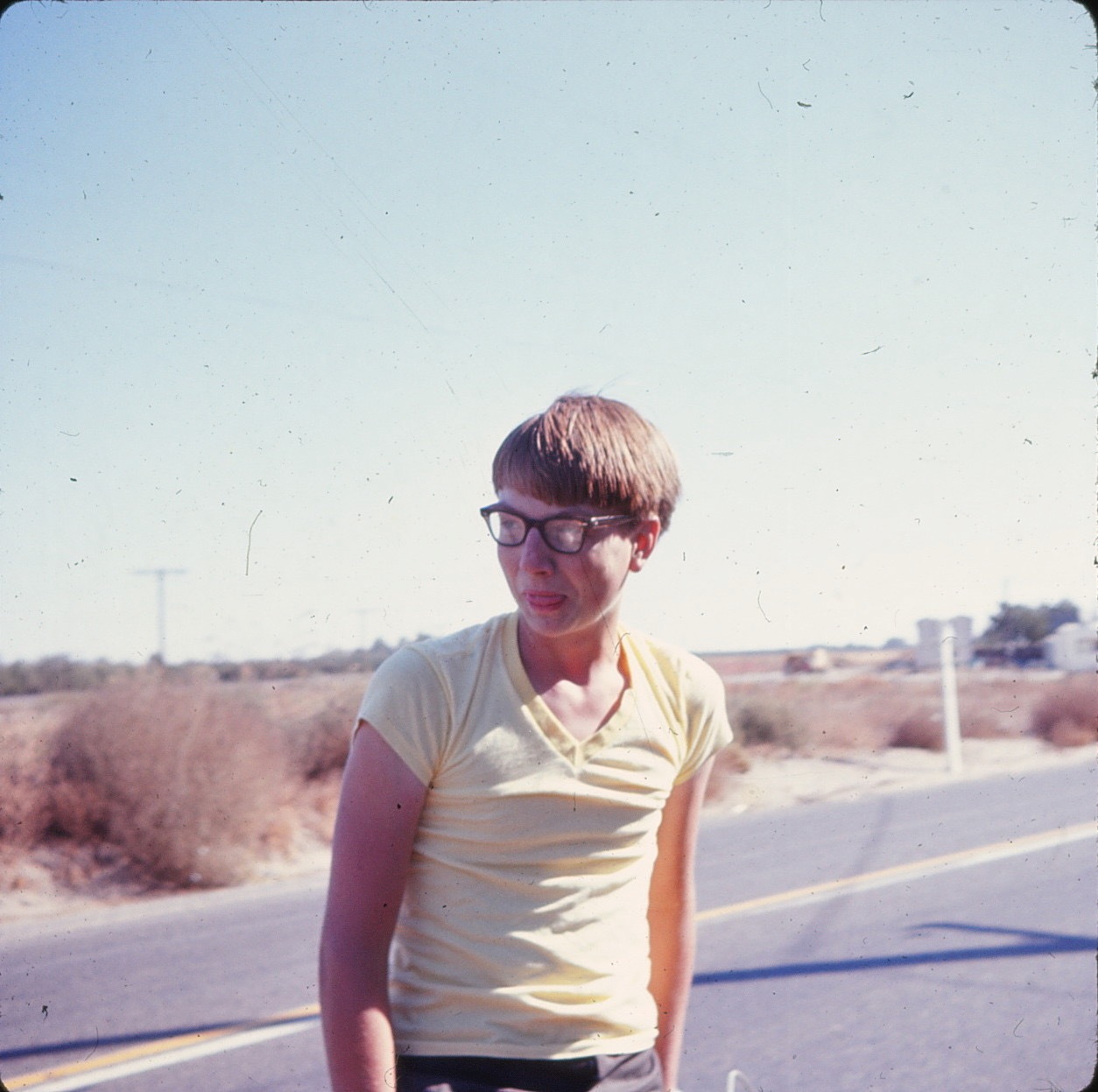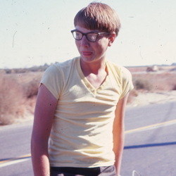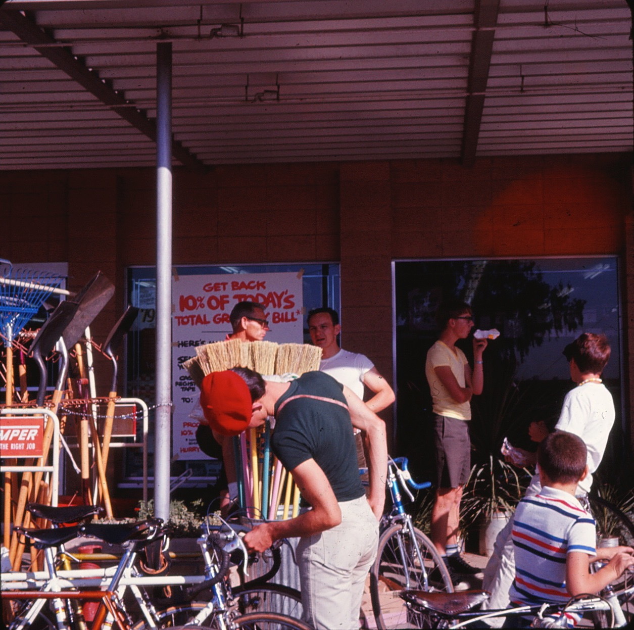 As we often did, we are taking a break at a local store along the way for soft drinks and snacks. At the bottom left is Jeff Cowdrey, wearing the then-popular in the club red beret, checking out a bike. In the back, near the center, drinking from a water bottle, is Fred Brockman. Some of the other people look familiar, but we have yet to associate them with a name.