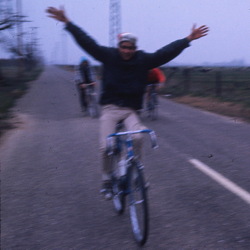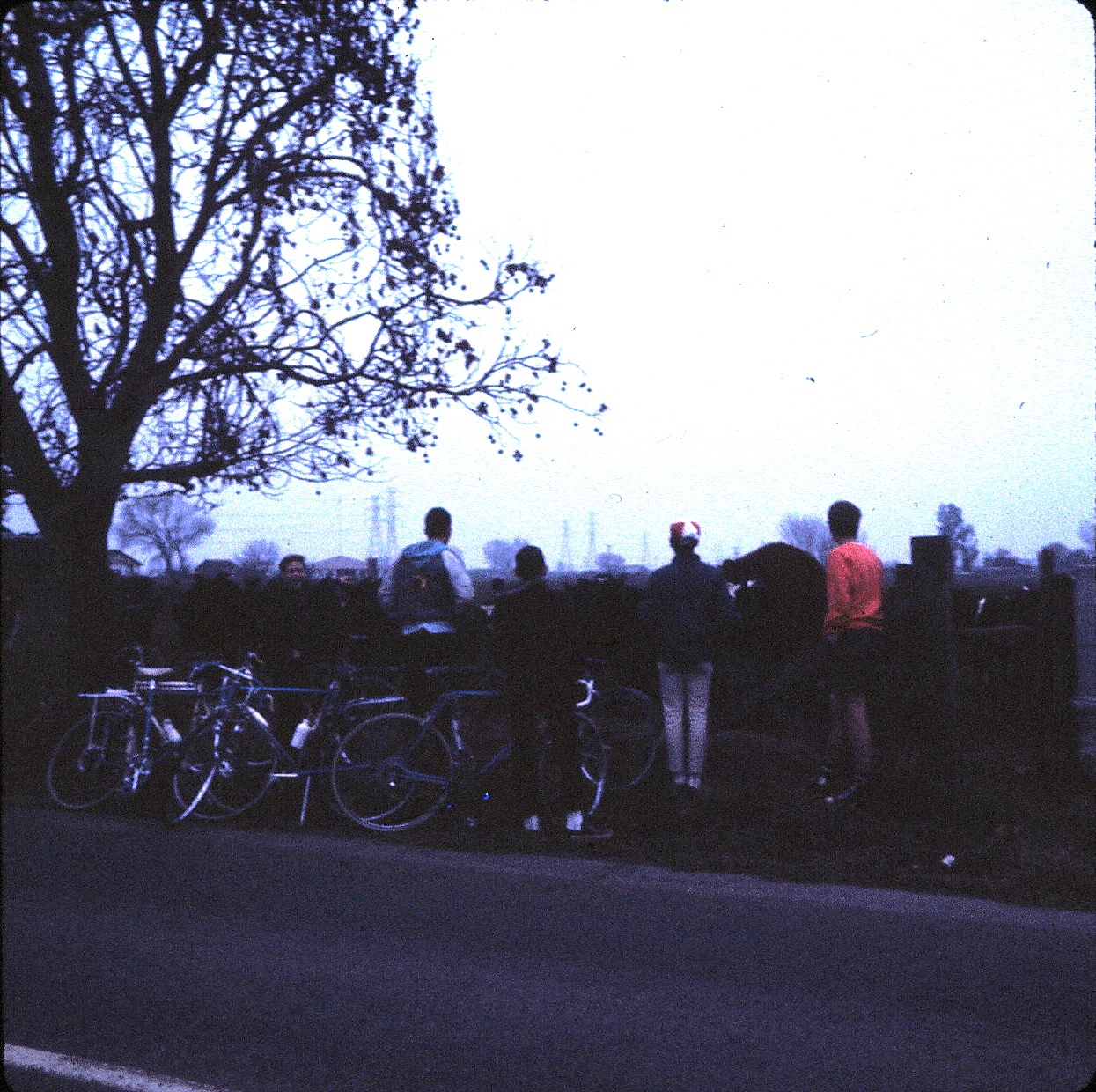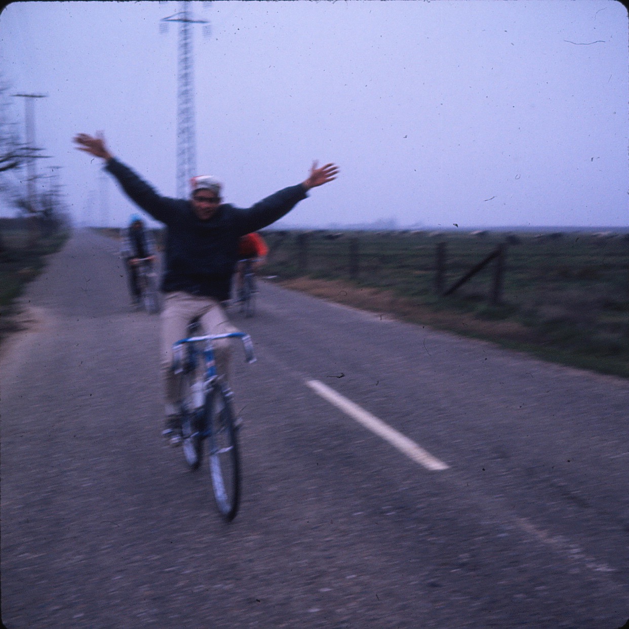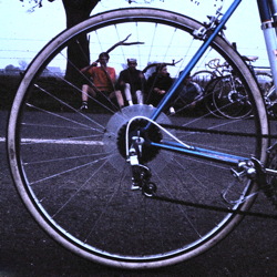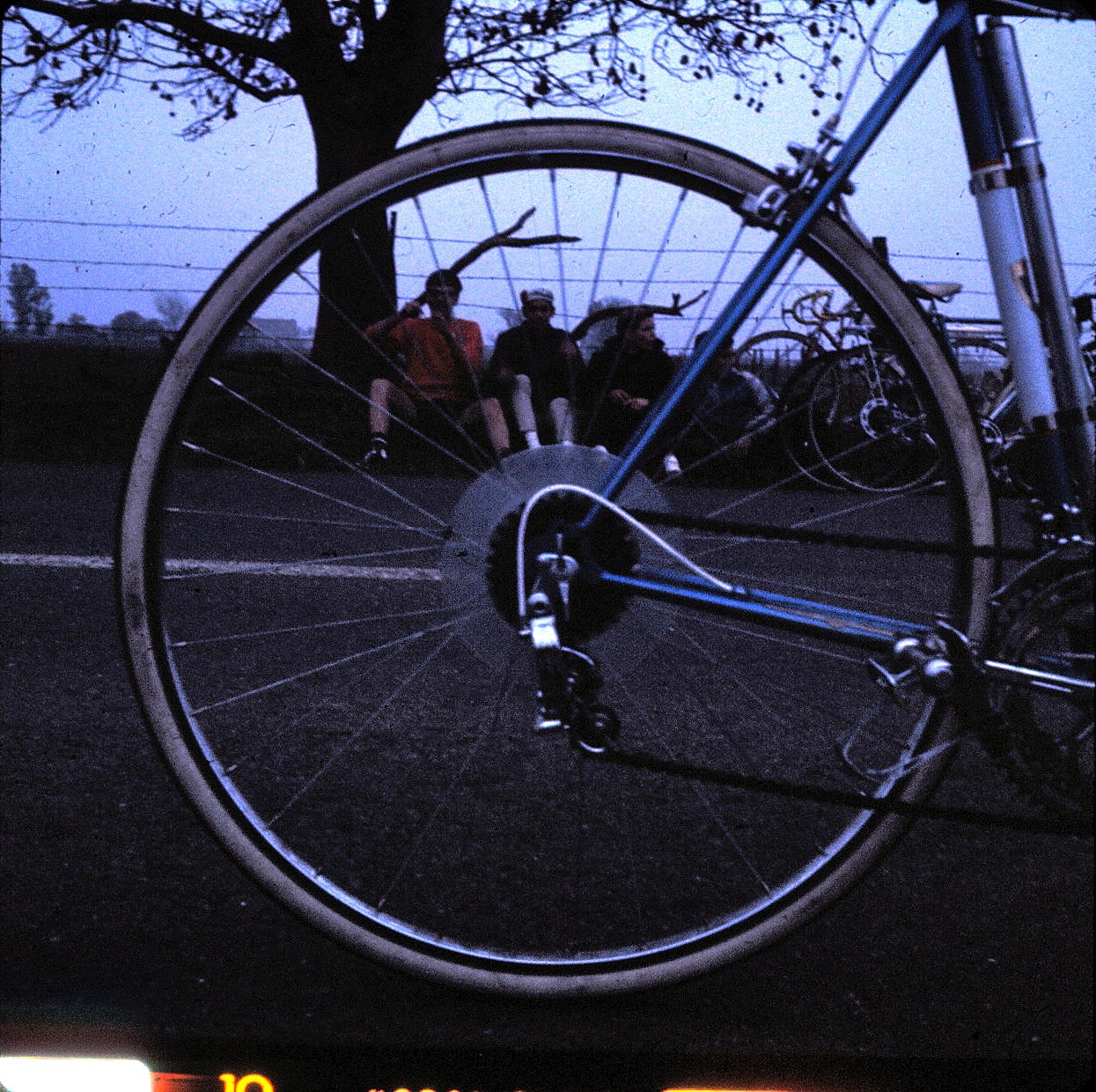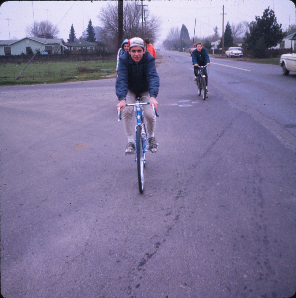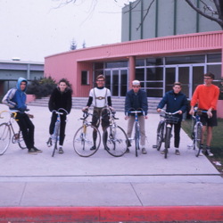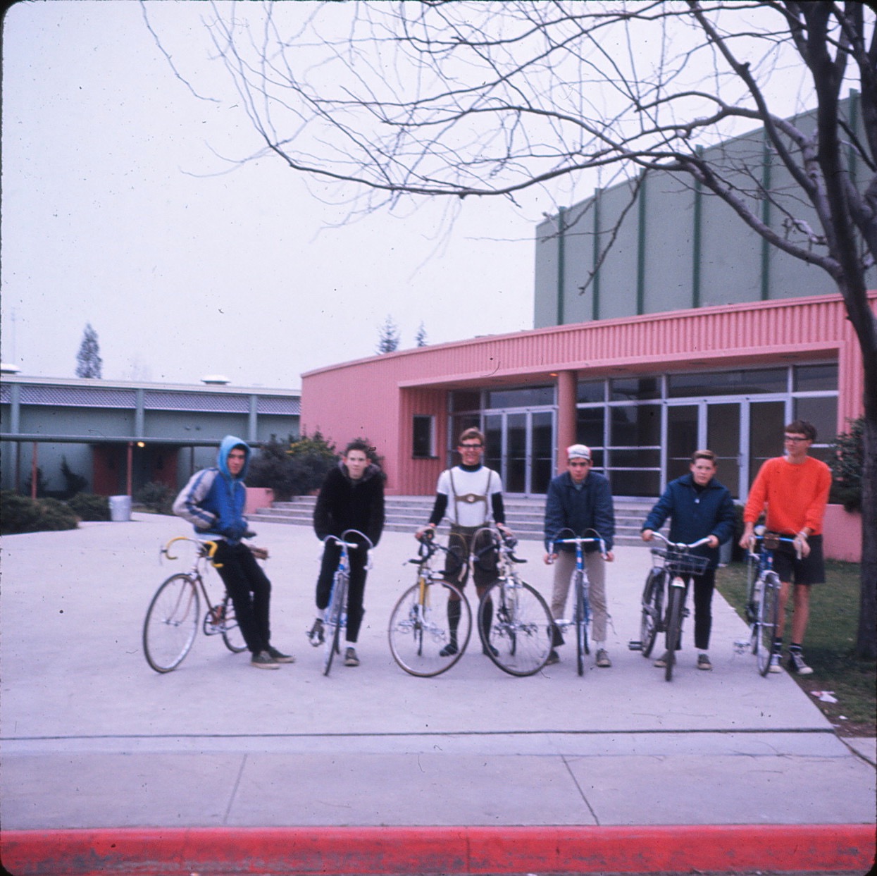 Unknown Rider, Unknown rider, Eldon Rosenow (holding both his Masi and my Peugeot), John Campopiano, Unknown Rider (on a balloon-tire bike), Fred Brockman