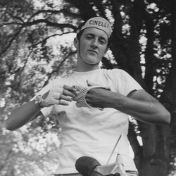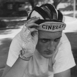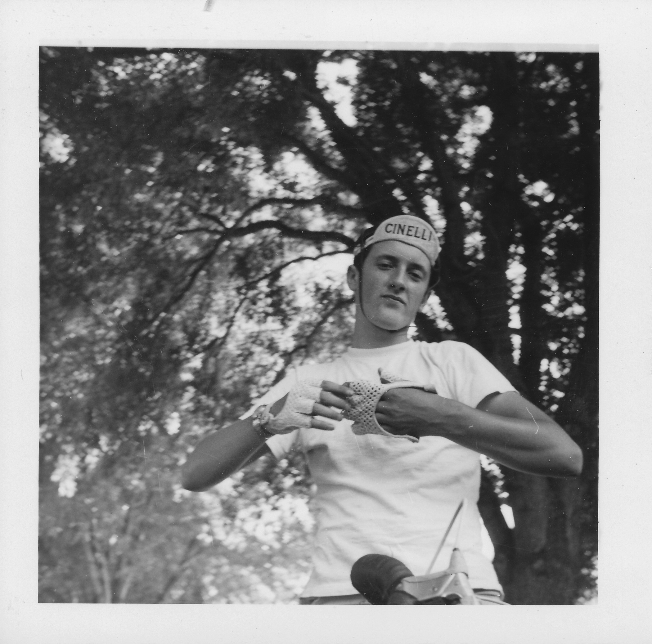 Tom Woods, looking goofy. Note the leather strip helmet that we all wore "back in the day" (but only when racing.) I still prefer this style of glove to what is available today. Tom is posing on my Peugeot PX10.