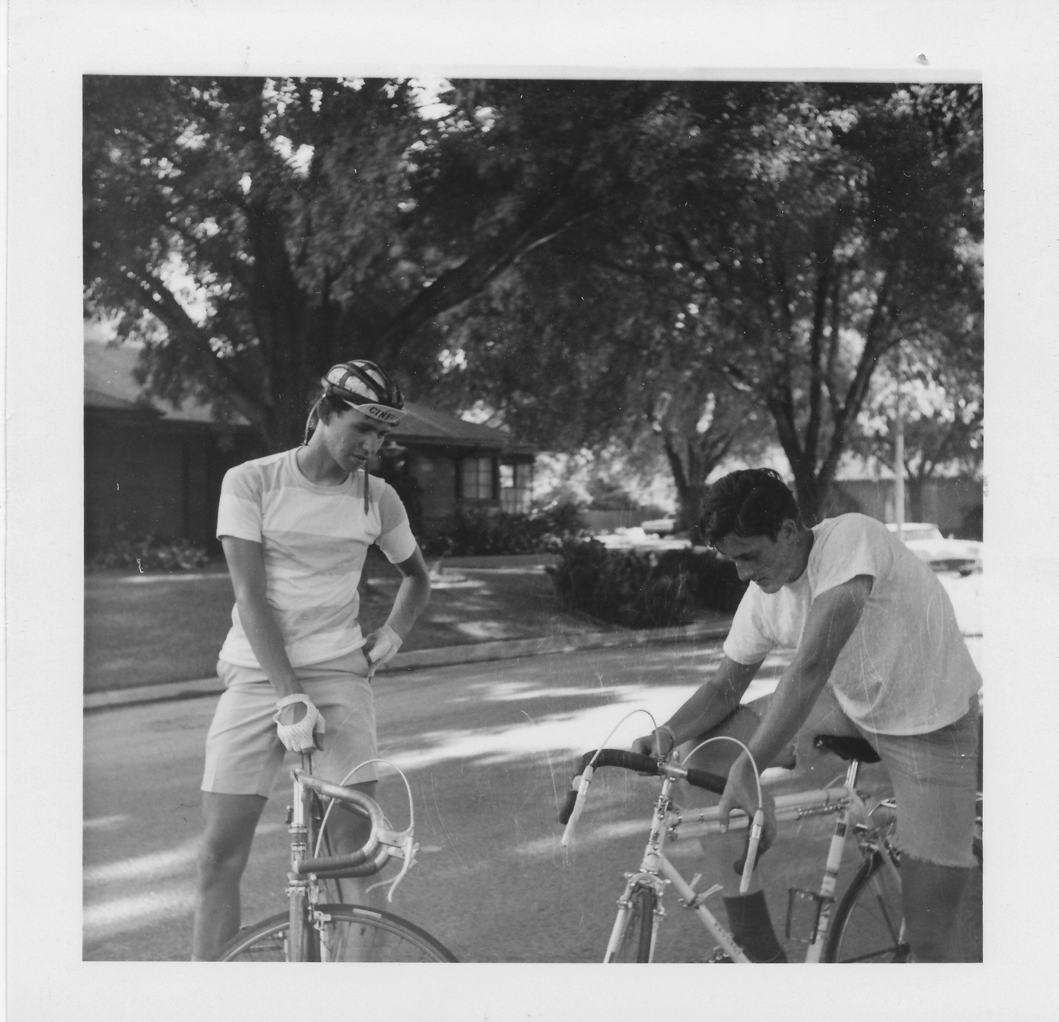 Jeff Cowdrey and Tom Wood. We only had my set of gloves, hat, and helmet, so Jeff is wearing them in this picture. Tom is still on my Peugeot, I think this is Jeff's own bike, a lower level Frejus, if memory serves.
