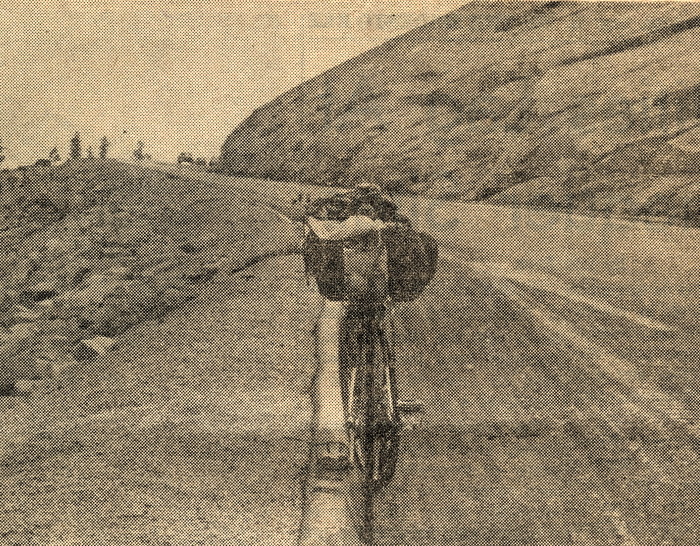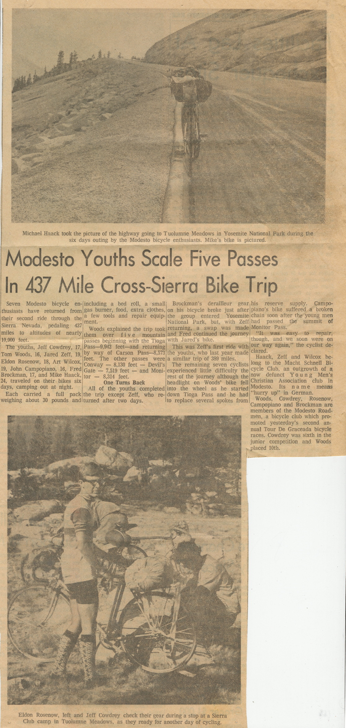 All of the youths completed the trip except Zeff, who returned after two days. Brockman's derallleur gear on his bicycle broke just after the group entered Yosemite National Park, but, with Zeff returning, a swap was made and Fred continued the journey with Jared's bike. This was Zeff's first ride with the youths, who last year made a similar trip of 389 miles. The remaining seven cyclists experienced little difficulty the rest of the journey although the headlight on Woods' bike fell into the wheel as he started down Tioga Pass and he had to replace several spokes from his reserve supply. Campopiano's bike suffered a broken chain soon after the young men had passed the summit of Monitor Pass. 'It was easy to repair, though, and we soon were on our way again," the cyclist declared. Haack, Zeff and Wilcox belong to the Macht Schnell cycle Club, an outgrowth of a now defunct Young Men's Christian Association club in Modesto. Its name means "hurry up" in German. Woods, Cowdrey, Rosenow, Campopiano and Brockman are members of the Modesto Roadmen, a bicycle club which promoted yesterday's second annual Tour De Graceada bicycle races. Cowdrey was sixth in the junior competition and Woods placed 10th.