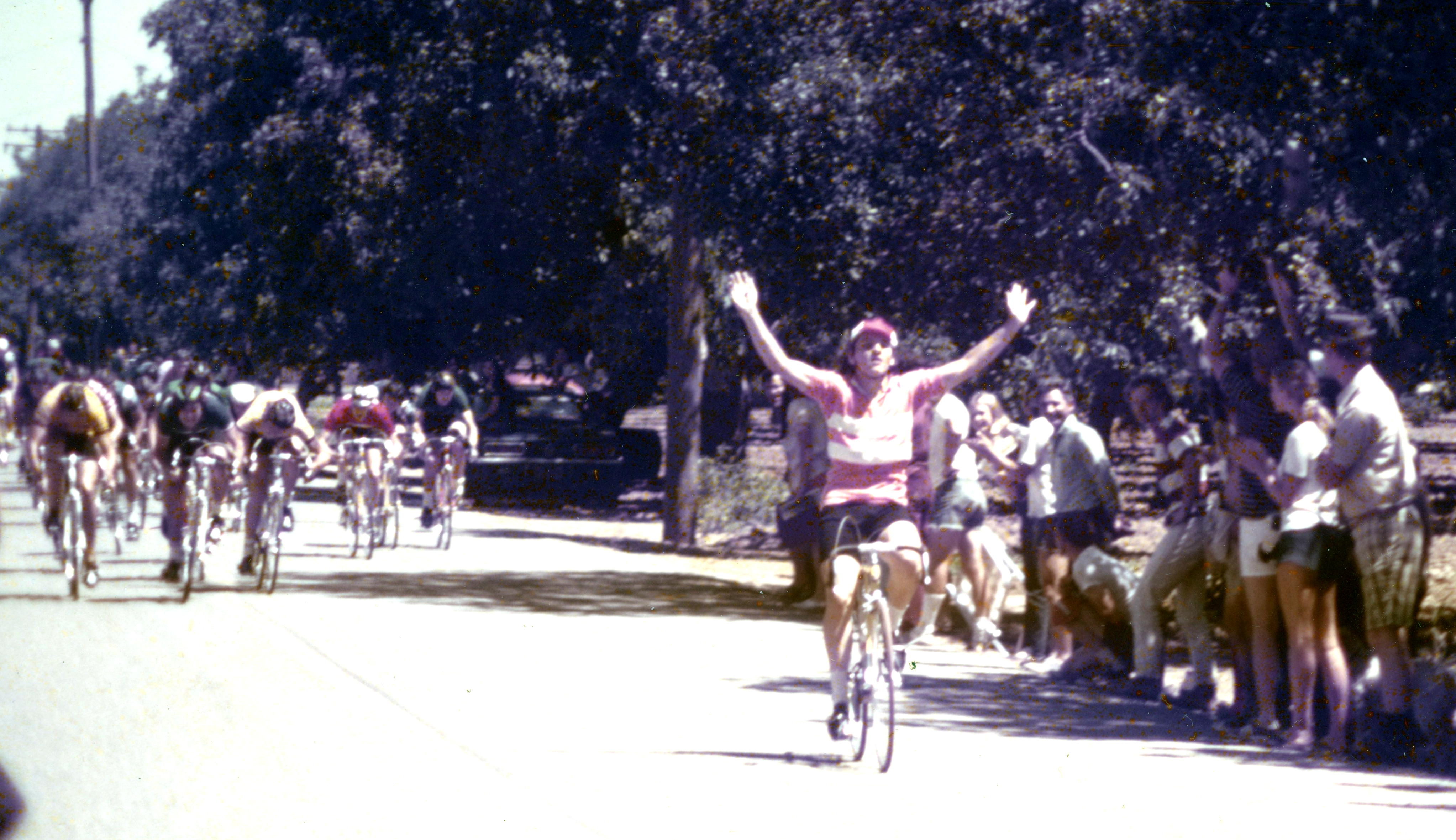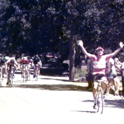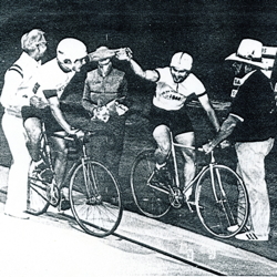 Eight years after pausing his cycling career to finish his education, Rod Jewett began his comeback, this time as a track racer. He raced against the likes of Fred Markum and Eric Heiden. He raced for the Los Altos/Bicycle Outfitter team. Rod Jewett is on the bicycle to right and his teammate Lee Fleming on the left. (Picture supplied by Michael Jewett.)