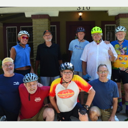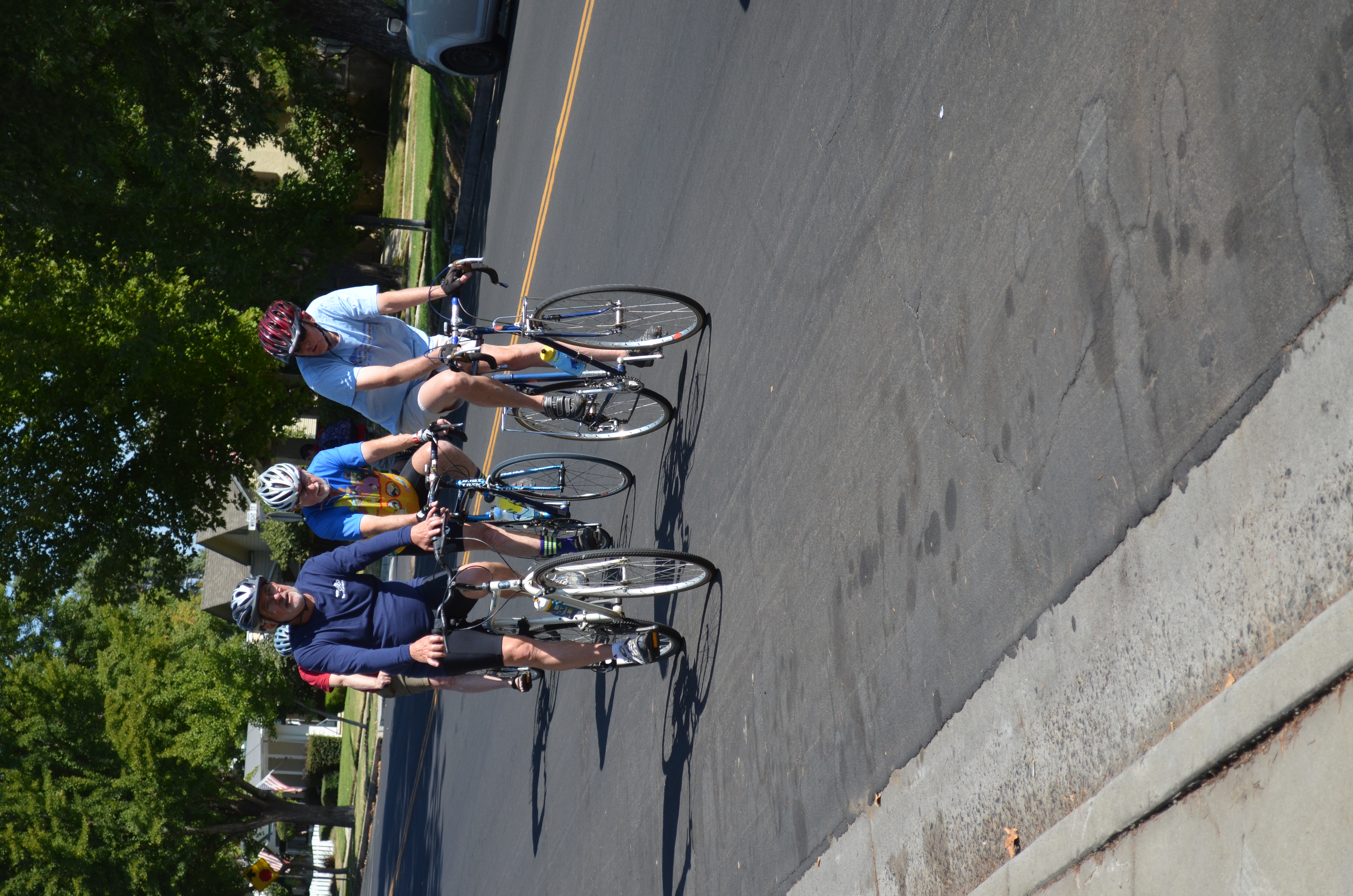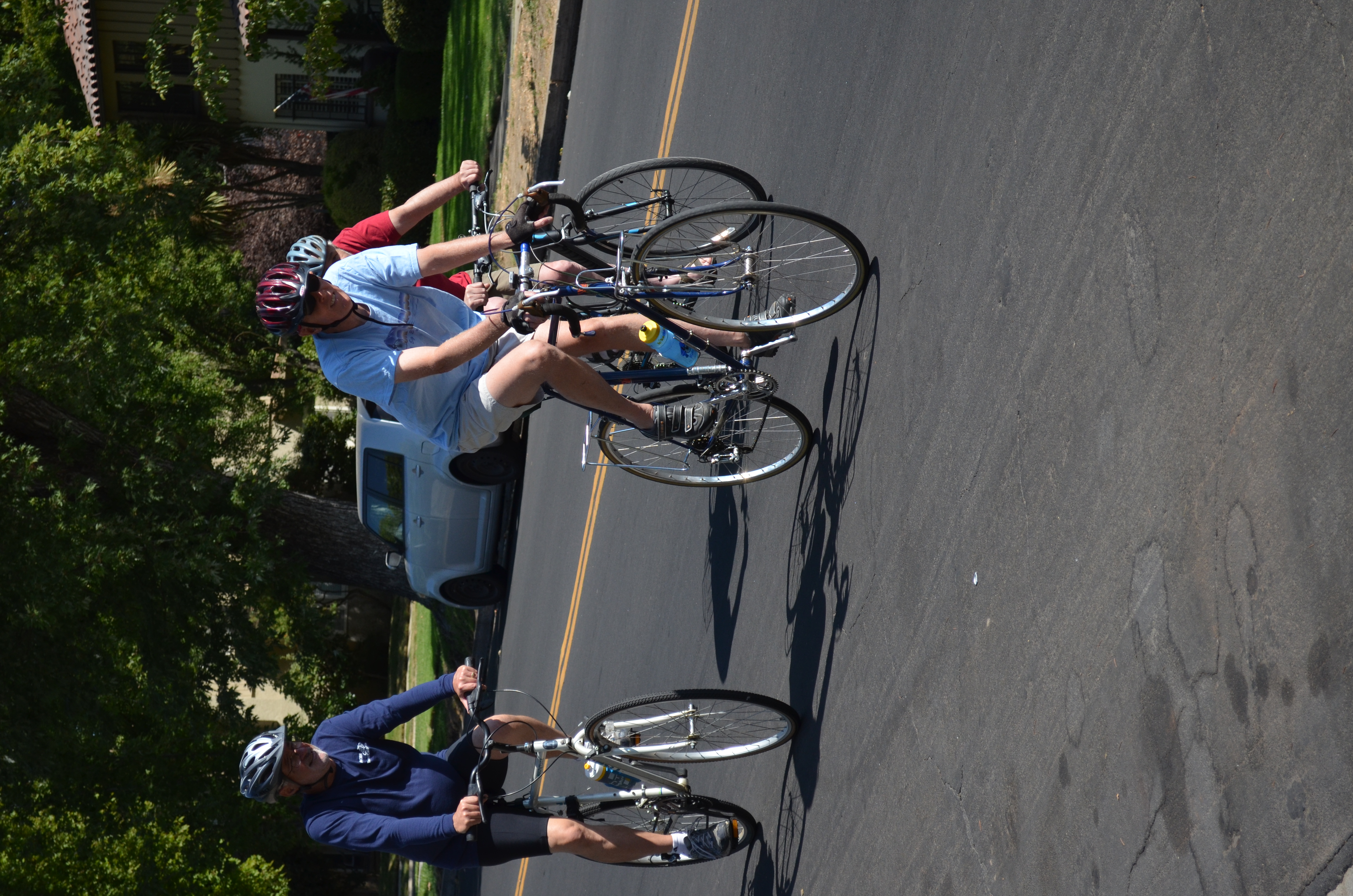 John, with his other bike, the mountain bike he rode for the day, Paul, Roger, and David. Stacy and Tom are cropped off the right side, click on the picture to see them.