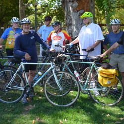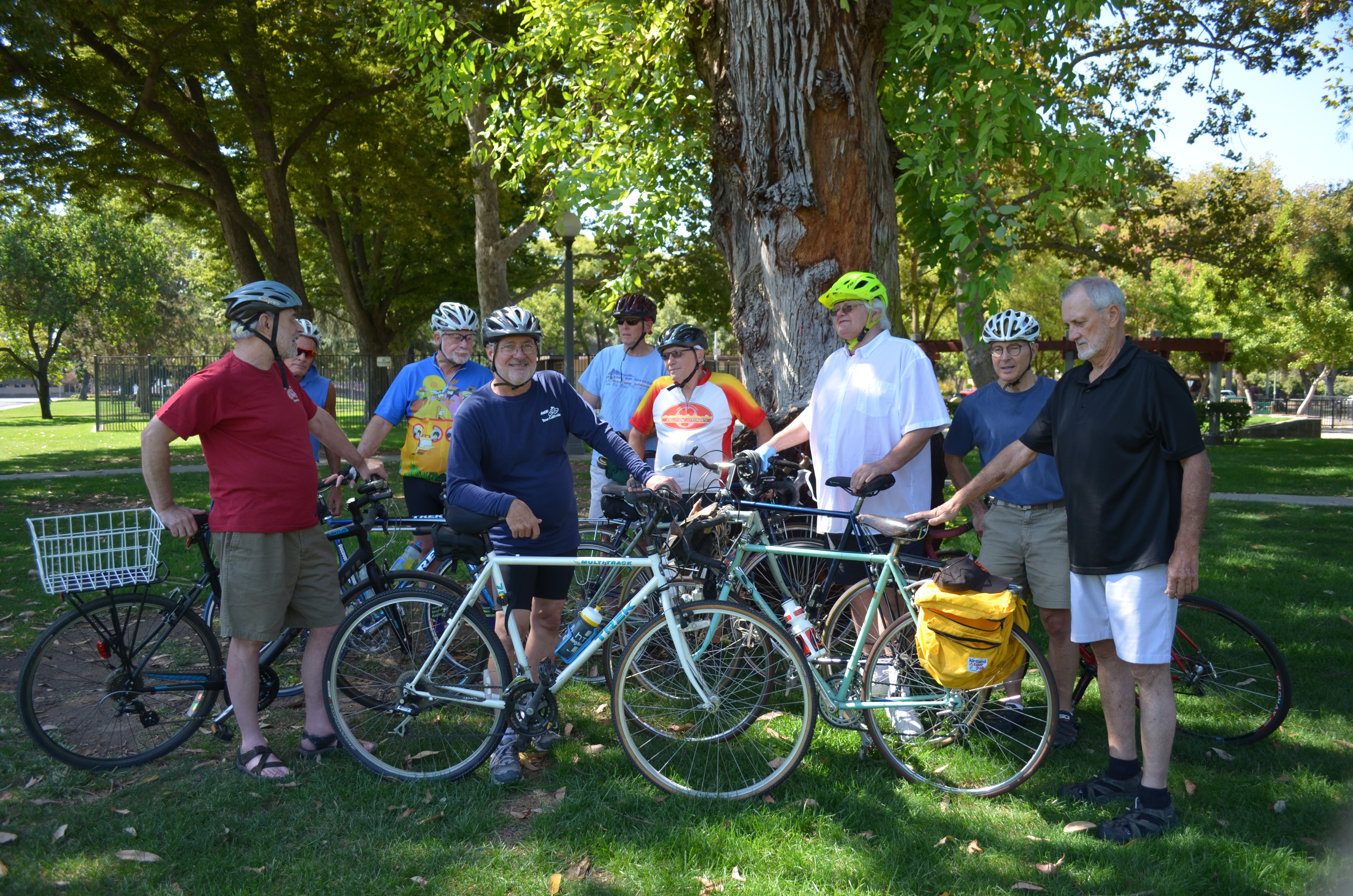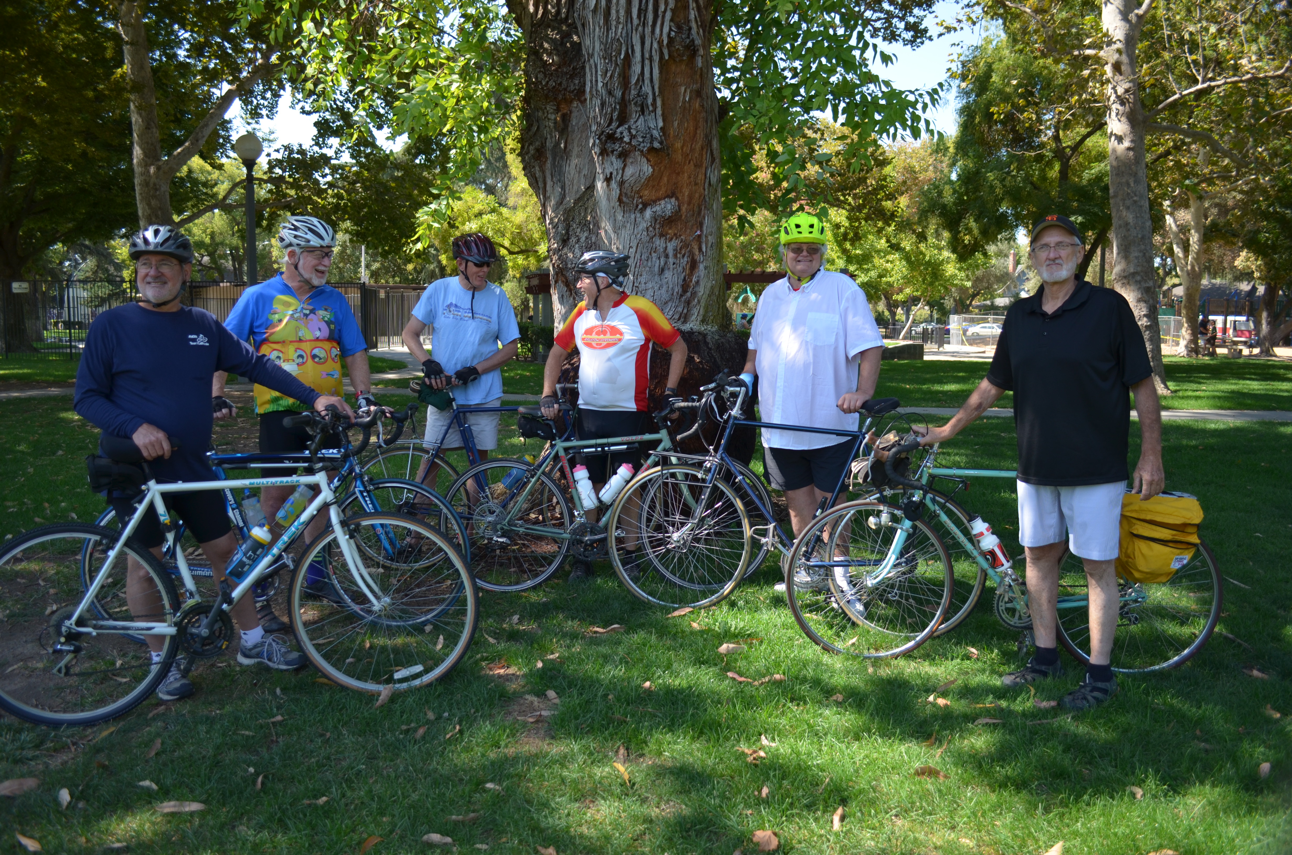 We assembled at John's house, and once we were all there, we took a group photo and then went over to Graceada Park for our symbolic rideLeft to right, back to front, are Michael Haack (not a member of the Modesto Roadmen, but of another Modesto club, Mach Schnell), Tom Woods, Roger Farschon, Stacy Dull, and Paul Robinson. In the front row are John Campopiano, Jeff Cowdrey, David Steffen, and Eldon Rosenow.