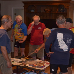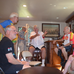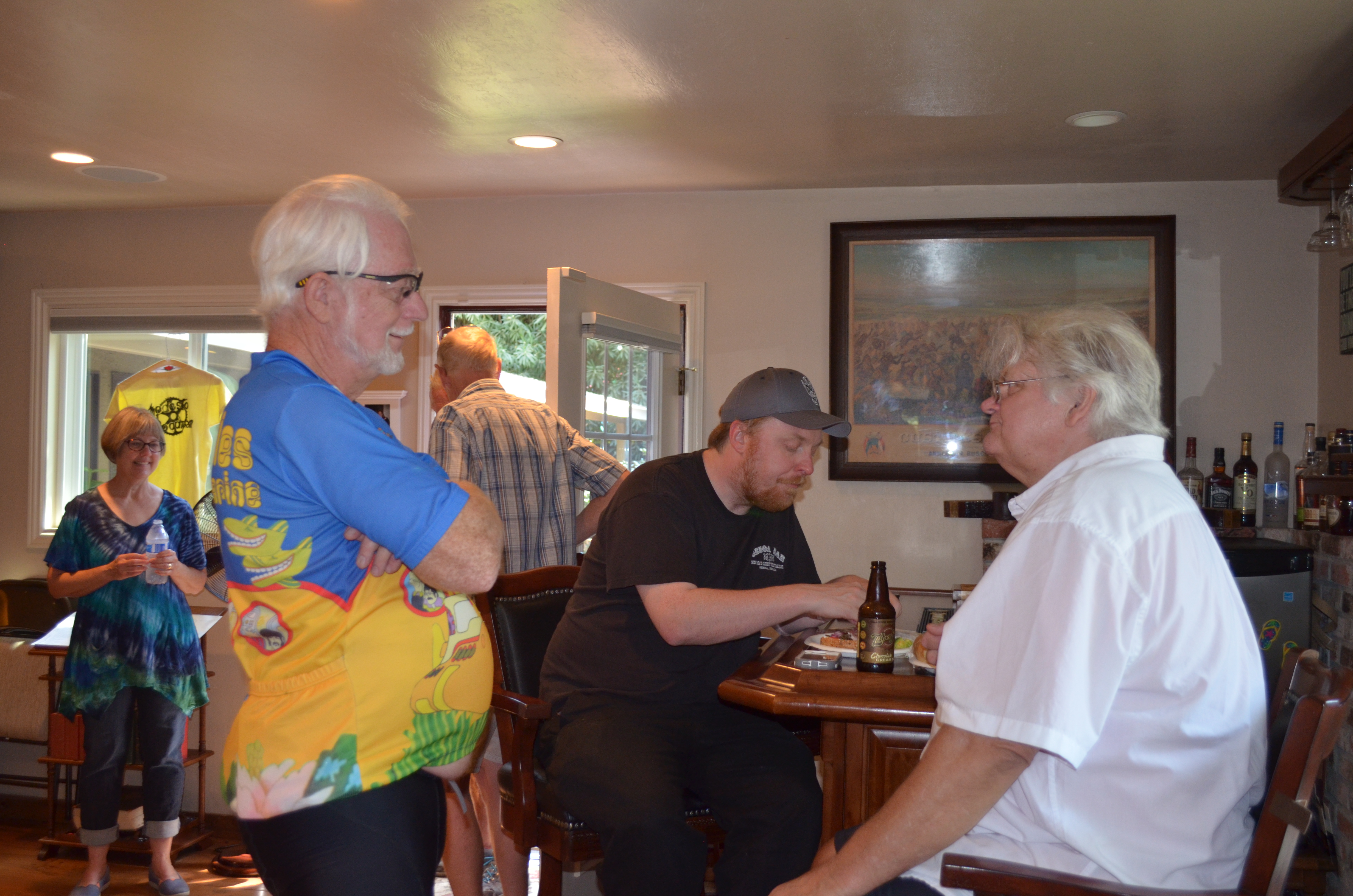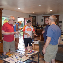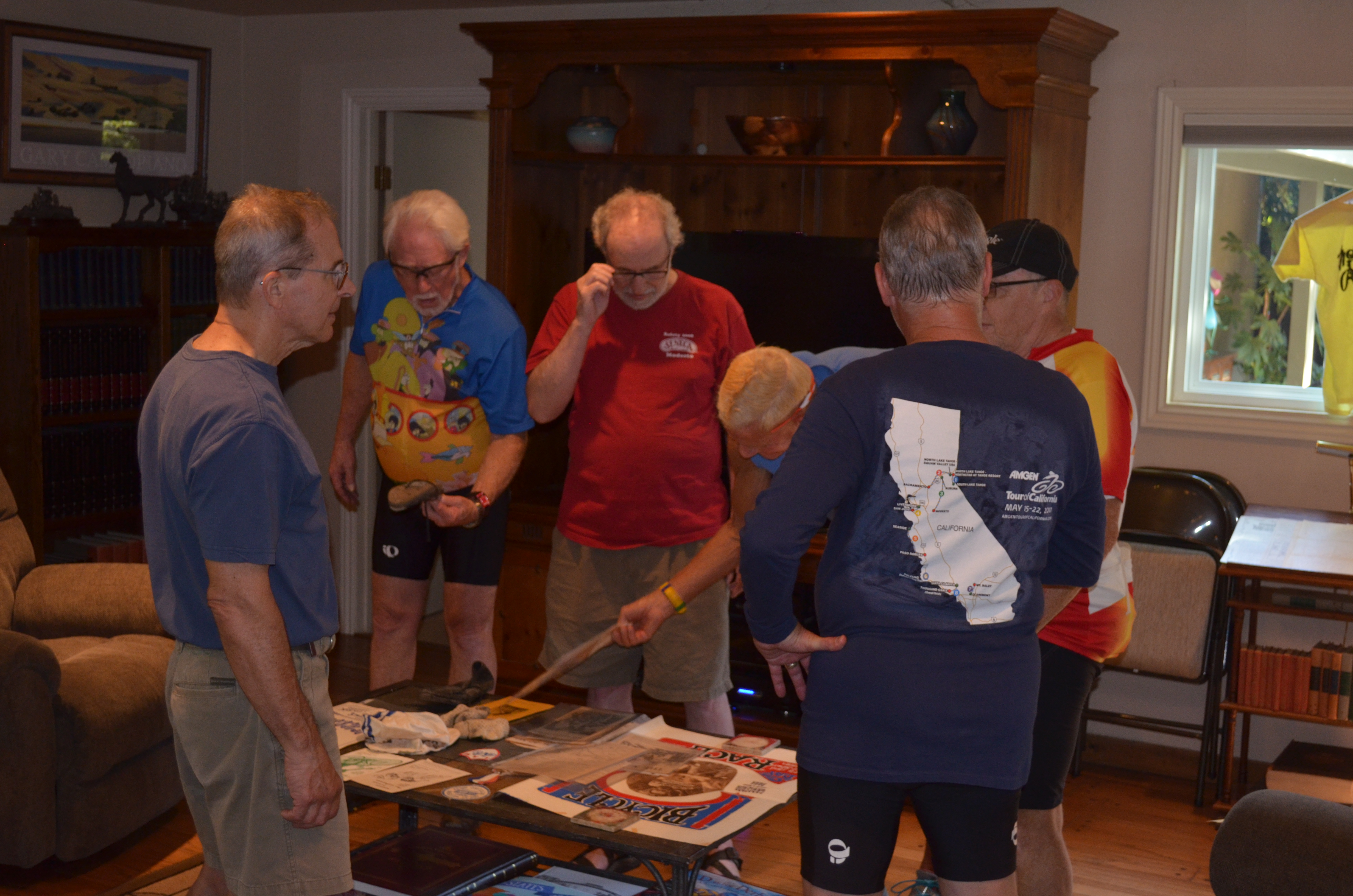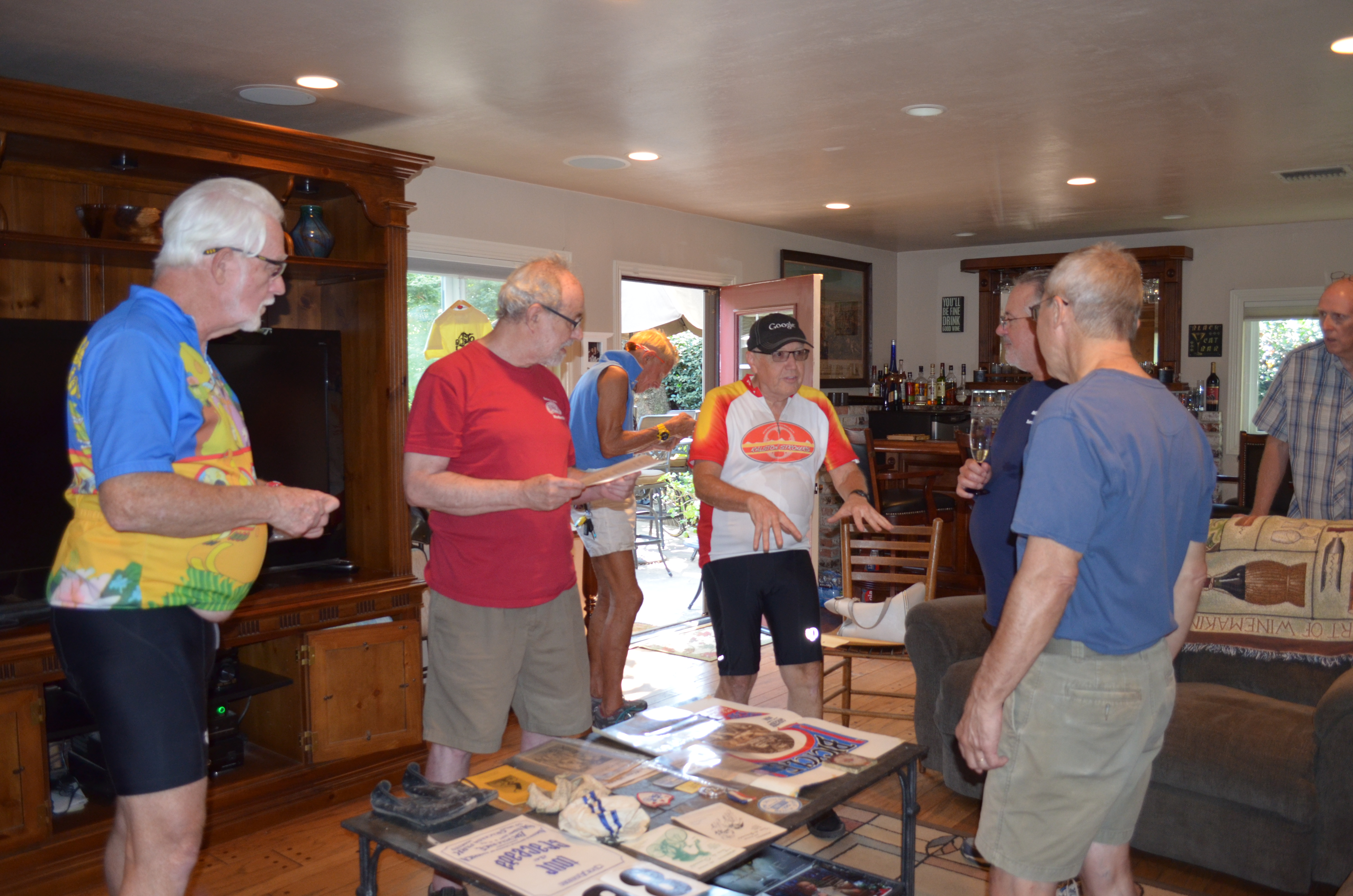 After the ride, we all went back to John and Wendy's for a delightful lunch they provided, to talk, and to enjoy the amazing collection of Modesto Roadmen memorabilia John pulled together. Eldon, Paul, Jeff, Roger, John (from the back) and David (partially obscured) looking at the memorabilia.
