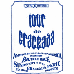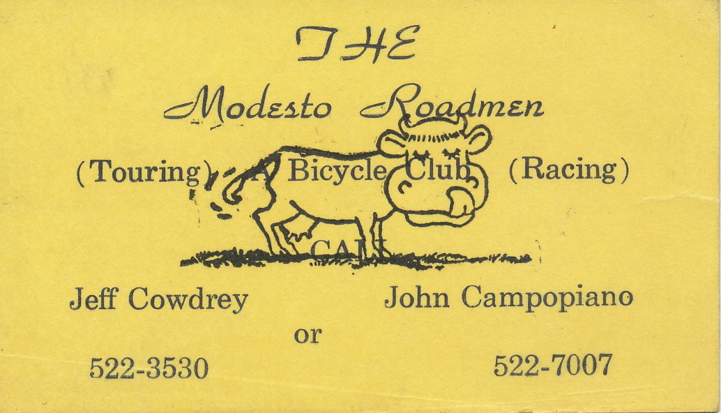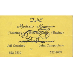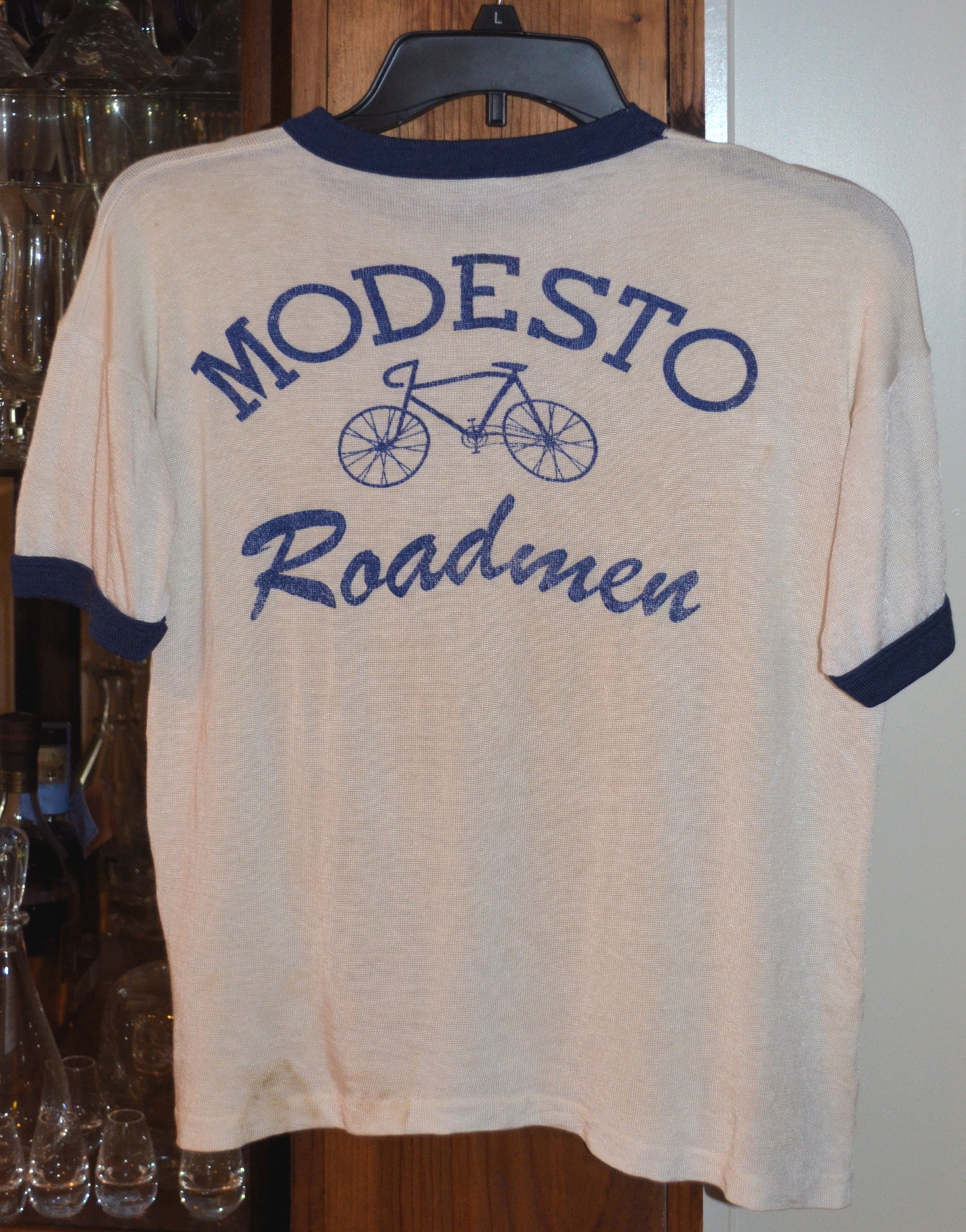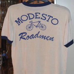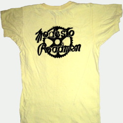 This T-Shirt was the first Modesto Roadmen garment we had. Jeff Cowdrey designed the logo, figured out how to build a silk screening apparatus out of scrap lumber, a nylon stocking, and white glue. We got each member to donate a plain white T-shirt, David Steffen's mother dyed them with Ritt dye in her washing machine, and then Jeff silkscreened the design on the back with fabric paint. T-shirt provided by David Steffen.